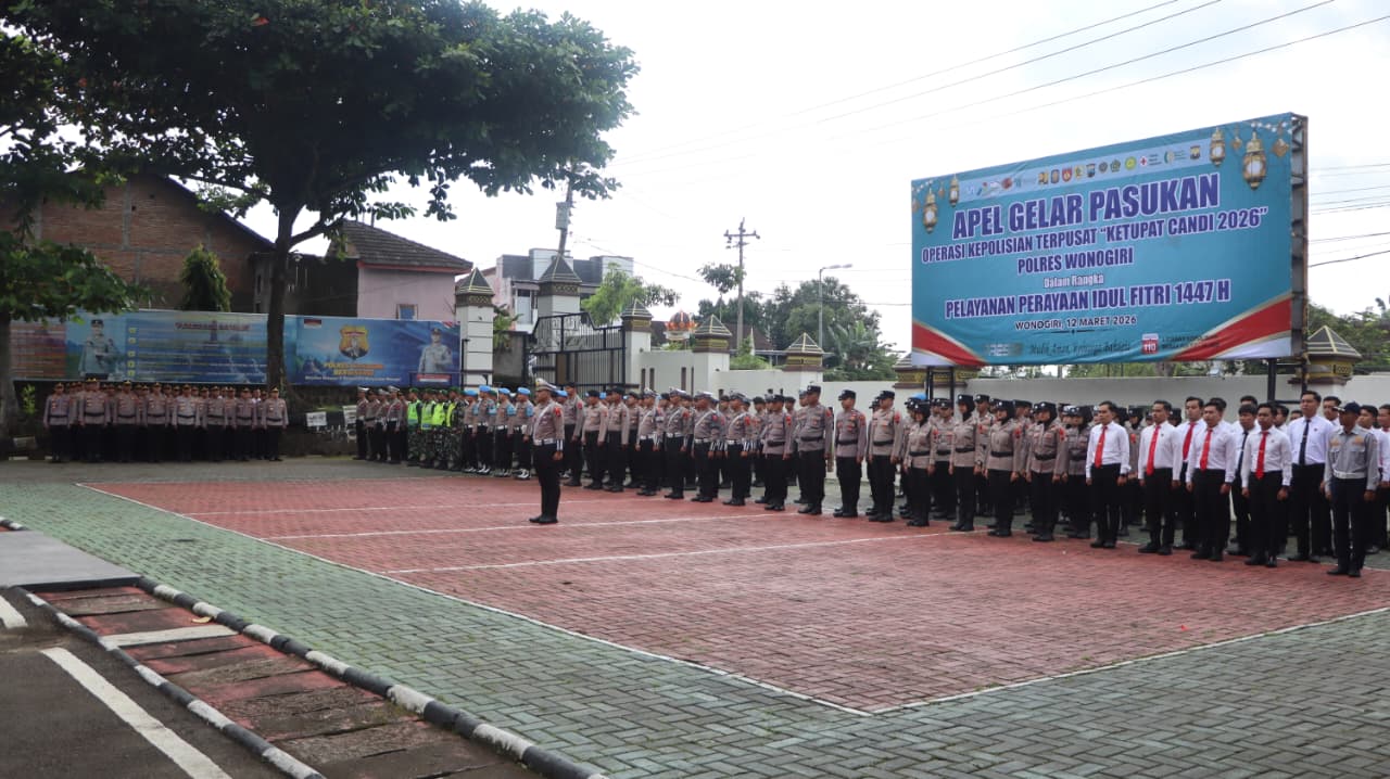 WONOGIRI – Polres Wonogiri menggelar Apel Gelar Pasukan Operasi Ketupat Candi 2026 di halaman Mapolres Wonogiri, Kamis (12/3/2026). Kegiatan ini menjadi tanda kesiapan Polres Wonogiri bersama unsur TNI dan stakeholder terkait dalam mengamankan arus mudik serta perayaan Hari Raya Idul Fitri 1447 Hijriah di wilayah Kabupaten Wonogiri.
