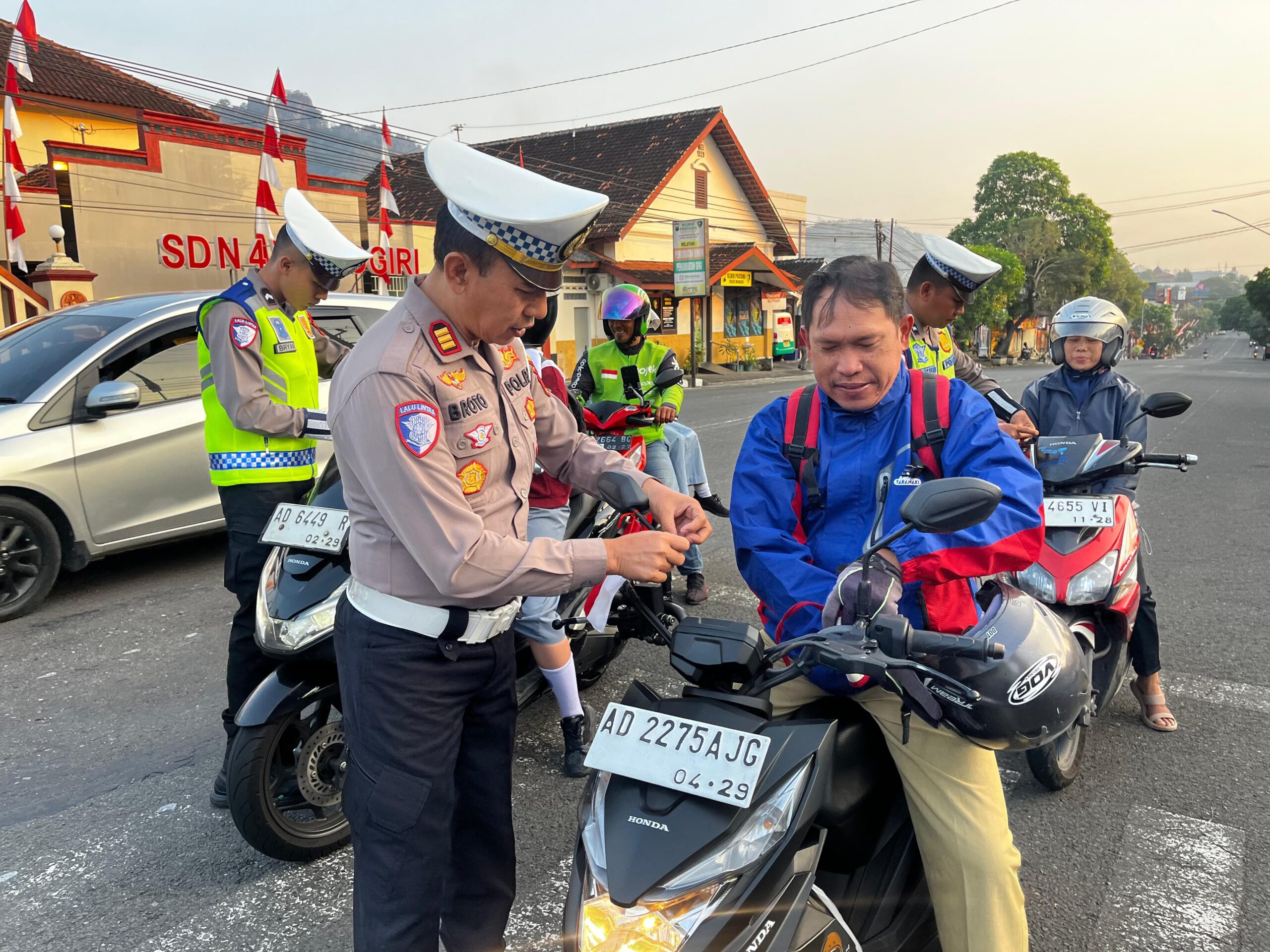 Wonogiri – Menyambut peringatan Hari Kemerdekaan Republik Indonesia ke-80, Satuan Lalu Lintas (Sat Lantas) Polres Wonogiri menggelar kegiatan “Polantas Menyapa” dengan membagikan dan memasang bendera Merah Putih kepada pengguna jalan, Senin (11/8/2025).