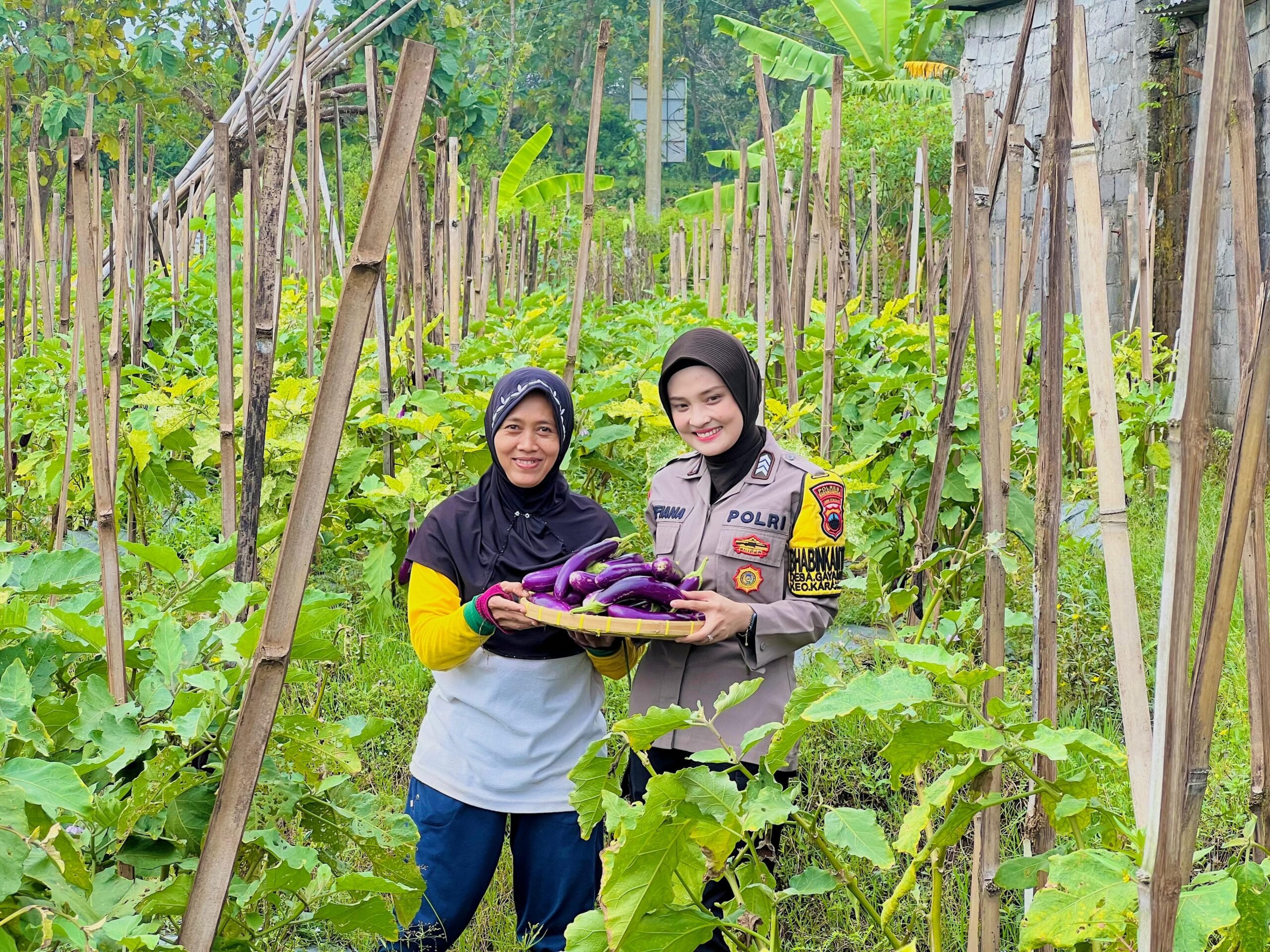 Karanganyar-Sebagai bentuk nyata dukungan terhadap program ketahanan pangan, Brigadir Sufiana selaku Bhabinkamtibmas Kelurahan Gayamdompo turut serta mendampingi warga dalam kegiatan panen terong di kebun pekarangan milik warga