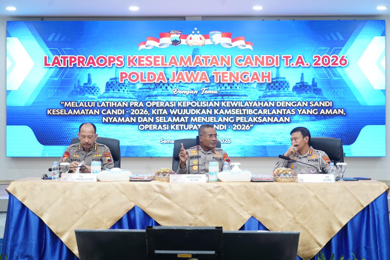 Polda Jateng-Kota Semarang | Sebagai bentuk kesiapan menjelang pelaksanaan Operasi Keselamatan Candi 2026, Polda Jawa Tengah menggelar Latihan Pra Operasi (Latpraops) yang diikuti oleh para Kabag Ops, Kasat Lantas, Kasat Intel, dan Kasi Humas dari 35 Polres jajaran. Kegiatan tersebut dilaksanakan pada Rabu, 28 Januari 2026, mulai pukul 08.00 WIB bertempat di Gedung Borobudur Mapolda Jateng.