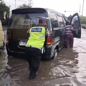 *Demi Keselamatan Pengguna Jalan, Polisi Basah Kuyup Atur Arus Lalin di Tengah Banjir*
