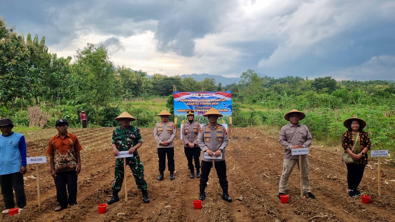 Wonogiri – Polres Wonogiri bersama Forkopimda melakukan penanaman jagung serentak Kuartal I Tahun 2026 sebagai bagian dari dukungan terhadap program ketahanan pangan nasional. Kegiatan digelar di Lingkungan Keron Lor, Kelurahan Wuryorejo, Kecamatan Wonogiri, Sabtu (7/3/2026).