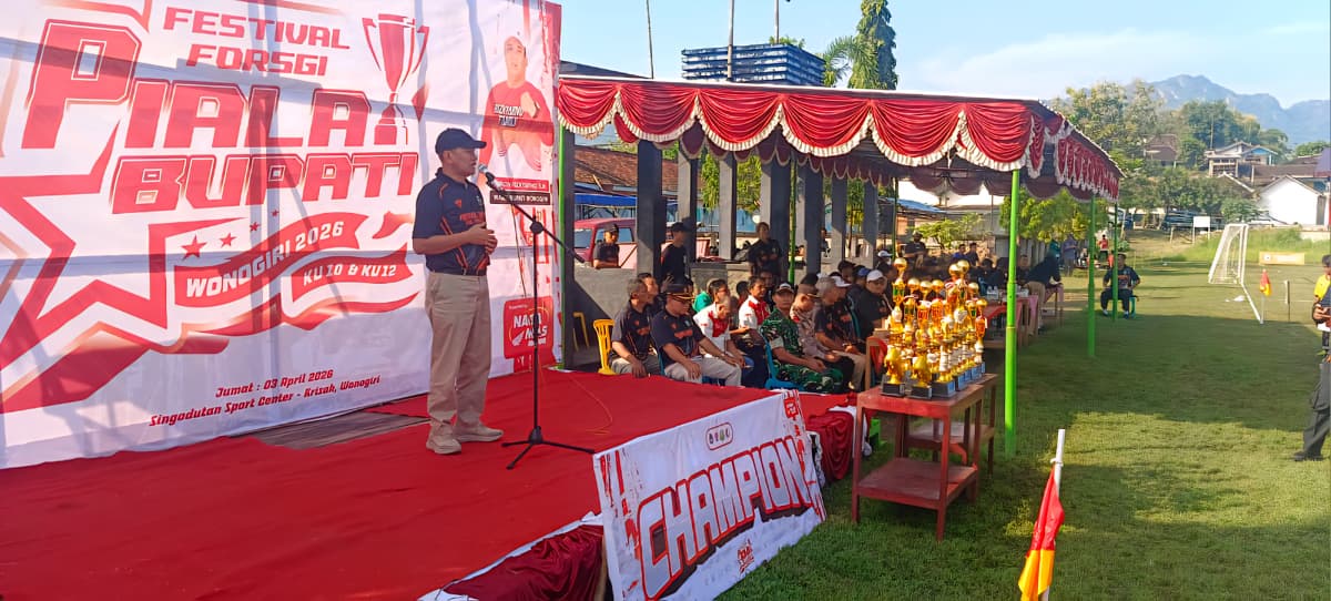 WONOGIRI – Festival FORSGI Piala Bupati Wonogiri Tahun 2026 untuk kelompok usia U12 dan U10 resmi dibuka pada Jumat (3/4/2026) pagi di Lapangan Sport Center Singodutan Stadium, Kecamatan Selogiri. Kegiatan ini diikuti sekitar 150 peserta dari berbagai tim sepak bola usia dini di wilayah Wonogiri.