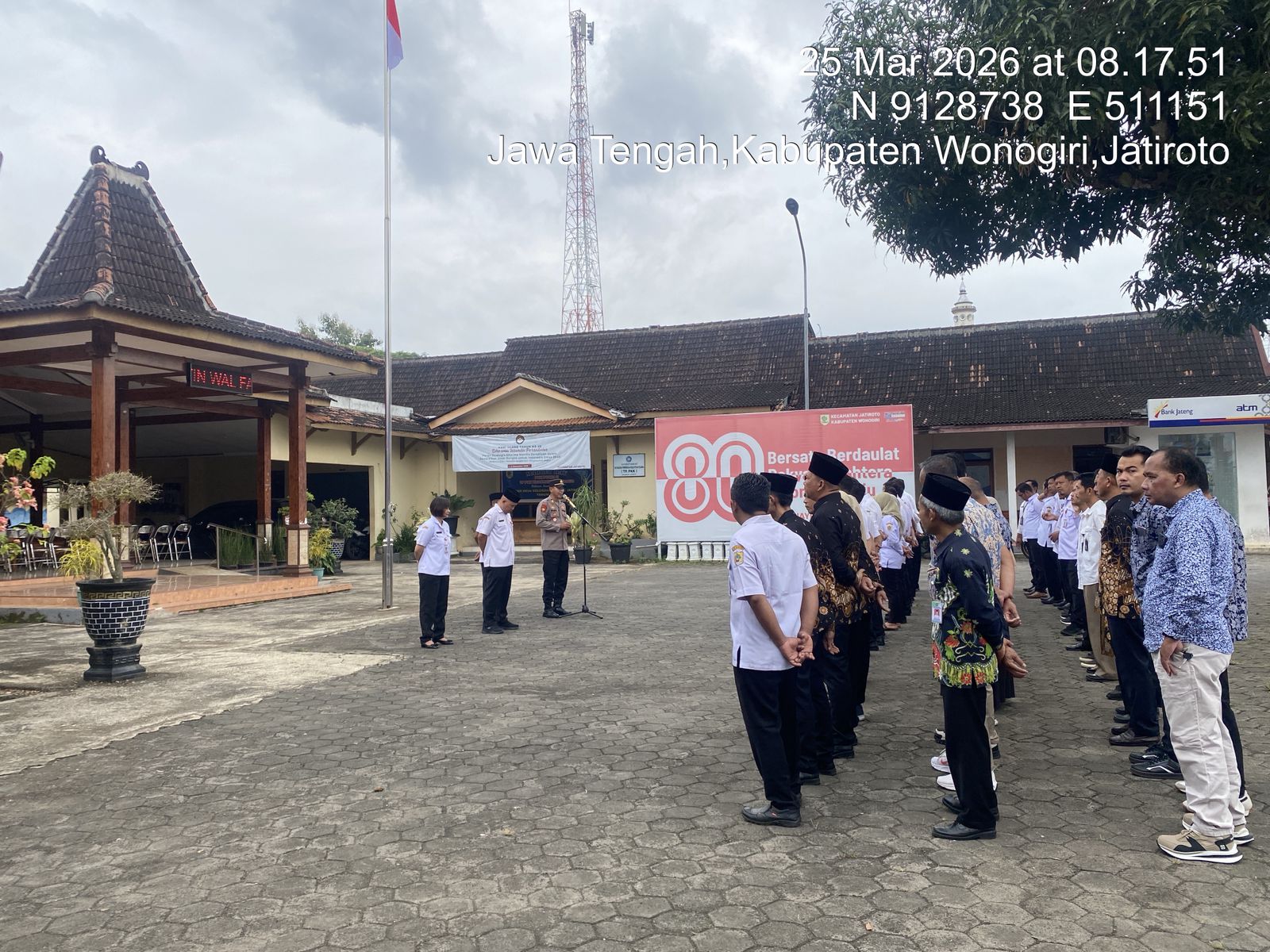 Apel yang dimulai pukul 08.00 WIB tersebut dipimpin oleh Camat Jatiroto Miran dan dihadiri Kapolsek Jatiroto AKP Pudiyono, Sekcam Jatiroto, para kepala desa/lurah se-Kecamatan Jatiroto, serta perwakilan dinas dan instansi terkait.