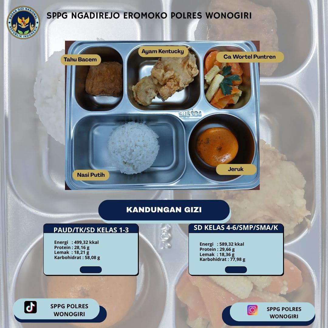 Menu MBG kali ini berisi nasi putih, ayam kentucky, cah wortel puntren, tahu bacem, dan jeruk. Semua makanan disiapkan untuk memastikan keseimbangan gizi anak-anak sekolah.