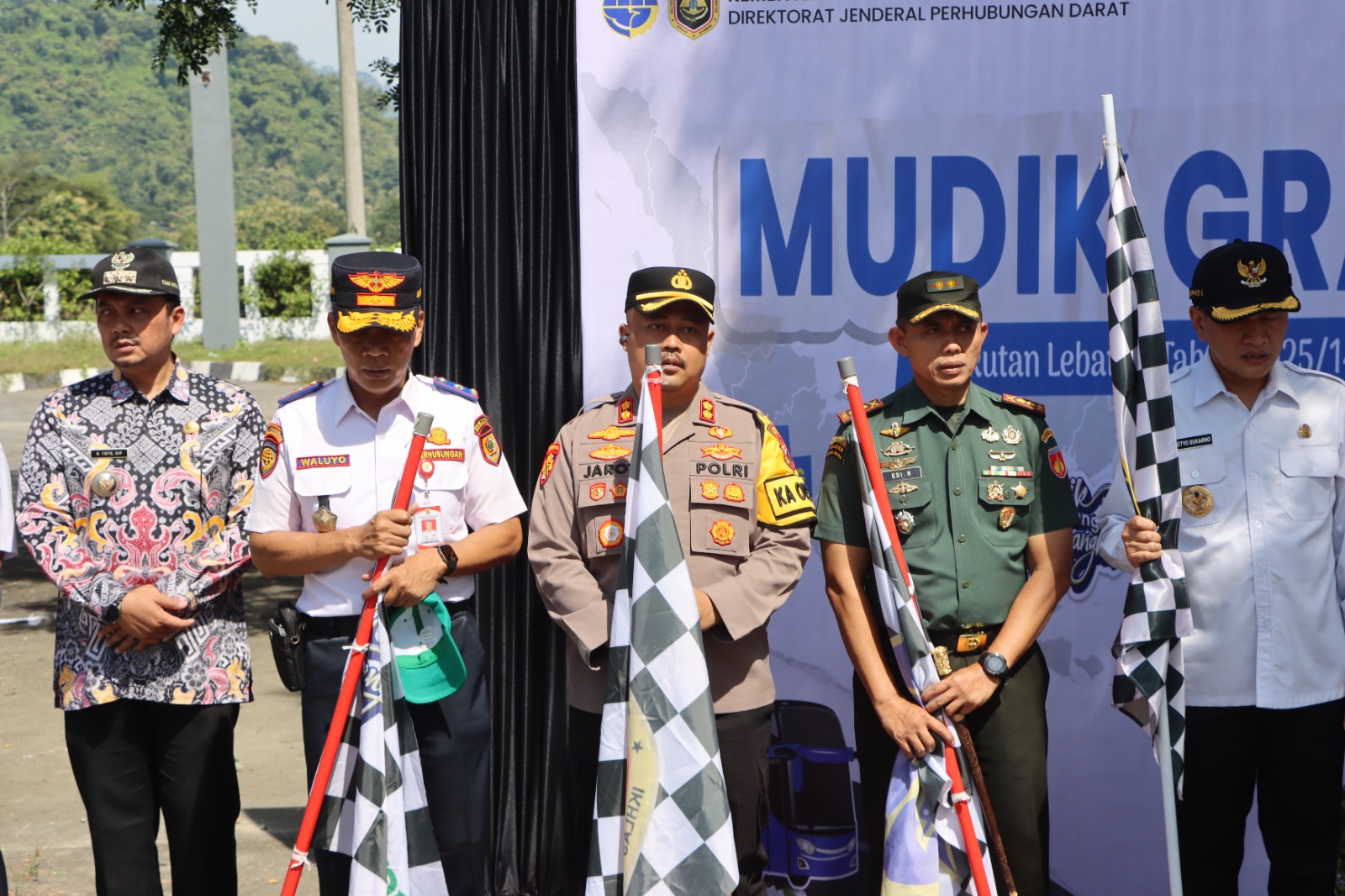 Wonogiri – Kapolres Wonogiri, AKBP Jarot Sungkowo, S.H., S.I.K., bersama Bupati Wonogiri Setyo Suakrno dan jajaran Forkopimda Kabupaten Wonogiri hadiri pemberangkatan rombongan mudik balik gratis yang digelar oleh Dirjen Perhubungan Darat Kemenhub RI di Terminal Giri Adipura Kabupaten Wonogiri, Sabtu (5/4/2025).