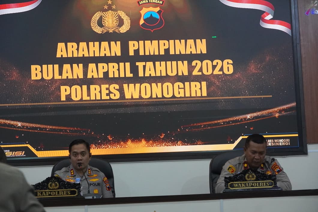 WONOGIRI – Kapolres Wonogiri AKBP Wahyu Sulistyo, S.H., S.I.K., M.P.M., menekankan pentingnya disiplin, profesionalitas, serta kesiapsiagaan seluruh personel dalam menjaga situasi kamtibmas tetap aman dan kondusif. Penegasan tersebut disampaikan saat memberikan arahan kepada Pejabat Utama (PJU) dan Kapolsek jajaran Polres Wonogiri di Aula Sanika Satyawada, Kamis (2/4/2026) pagi.