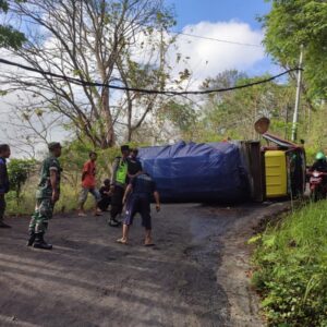 Polisi Evakuasi Truk Bermuatan Mie Instan yang Terguling di Tunggangan Jatiroto