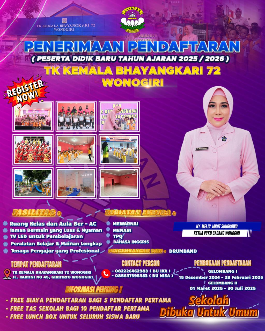 Sosialisasi ini bertujuan untuk menginformasikan kepada masyarakat bahwa saat ini TK Kemala Bhayangkari 72 Polres Wonogiri telah membuka pendaftaran untuk peserta didik baru hingga 30 Juli 2025.