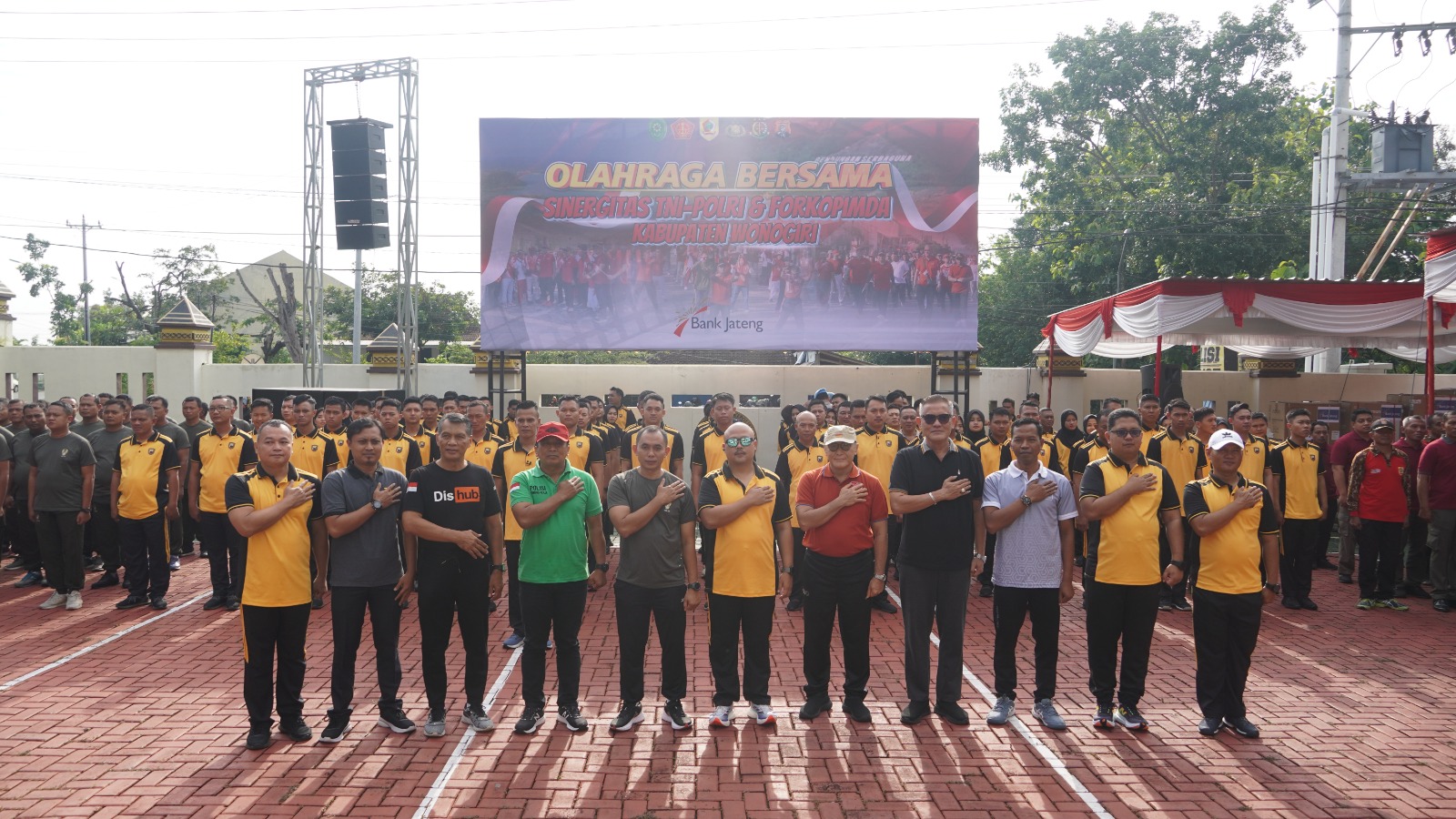 Olahraga bersama diawali dengan apel sinergitas bersama yang diikuti oleh ratusan anggota Polri, TNI, dan Forkopimda Kabupaten Wonogiri, selesai apel dilanjutkan dengan senam dan kegiatan ramah tamah. (Humas Polres Wonogiri Polda Jateng