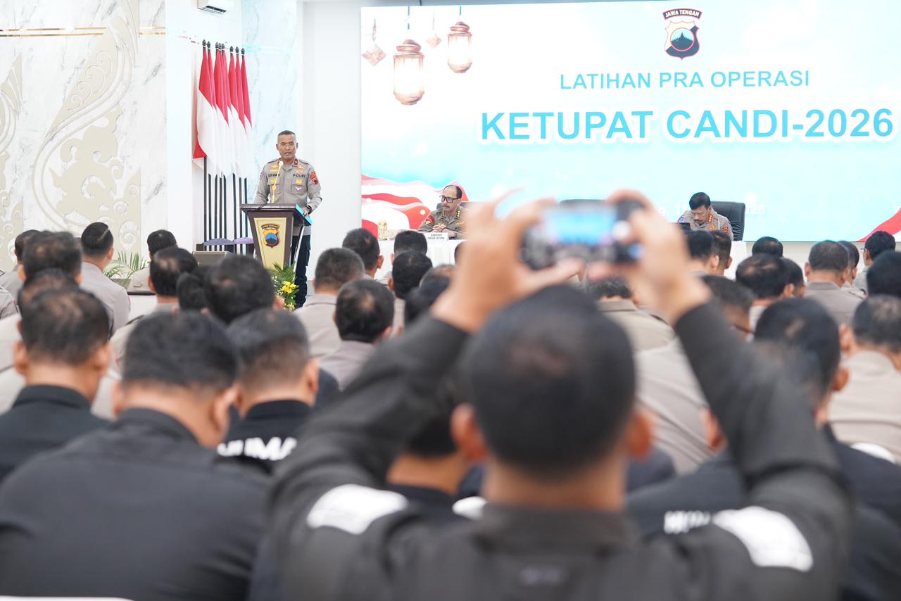 Semarang-Polda Jateng|Kepolisian Daerah Jawa Tengah mematangkan kesiapan pengamanan Hari Raya Idul Fitri 1447 H melalui kegiatan Latihan Pra Operasi (Lat Pra Ops) Terpusat dengan sandi “Ketupat Candi 2026”. Kegiatan yang digelar di Gedung Borobudur Mapolda Jawa Tengah pada Rabu (11/3/2026) tersebut dipimpin langsung oleh Wakapolda Jawa Tengah, Brigjen. Pol. Dr. Latif Usman, S.I.K., M. Hum didampingi Karo Ops, Dirlantas, Kabidhumas, serta dihadiri para Pejabat Utama Polda Jateng dan pejabat utama Polres jajaran.