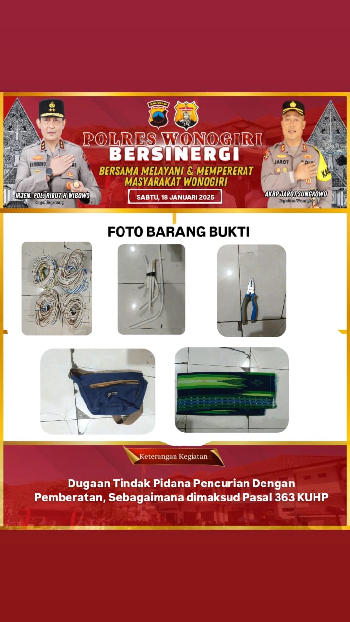Kapolres Wonogiri AKBP Jarot Sungkowo, S.H., S.I.K., melalui Kasi Humas AKP Anom Prabowo, S.H., M.H., pada Sabtu (18/1/2025) mengatakan, pelaku ditangkap sekitar pukul 23.00 WIB usai melakukan pencurian kabel listrik di PT. WMU.