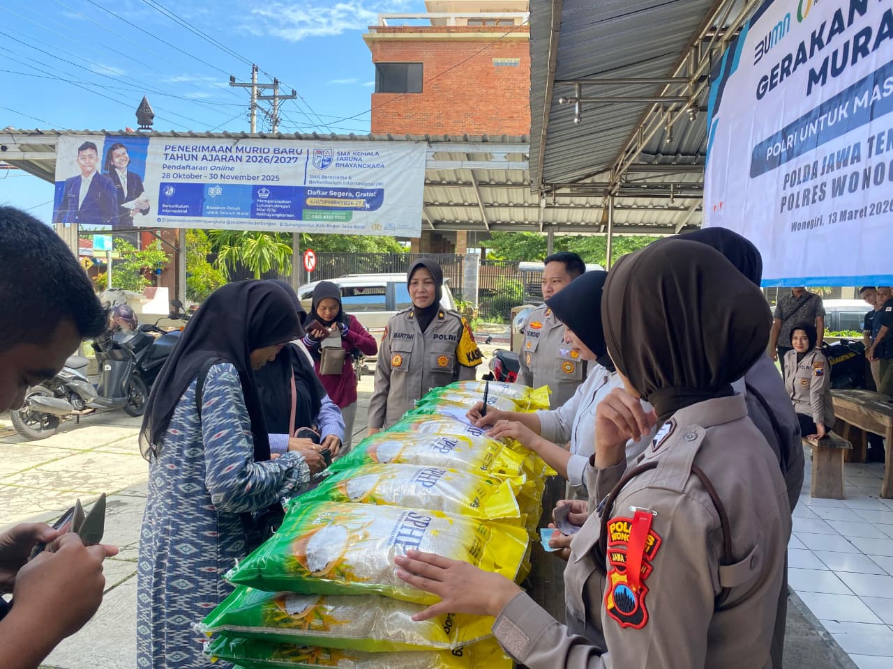 Kegiatan tersebut dilaksanakan pada Jumat (13/3/2026) sekitar pukul 09.00 WIB di halaman Polsek Kota Wonogiri dan mendapat sambutan antusias dari masyarakat yang hadir untuk memperoleh kebutuhan pokok dengan harga lebih murah.