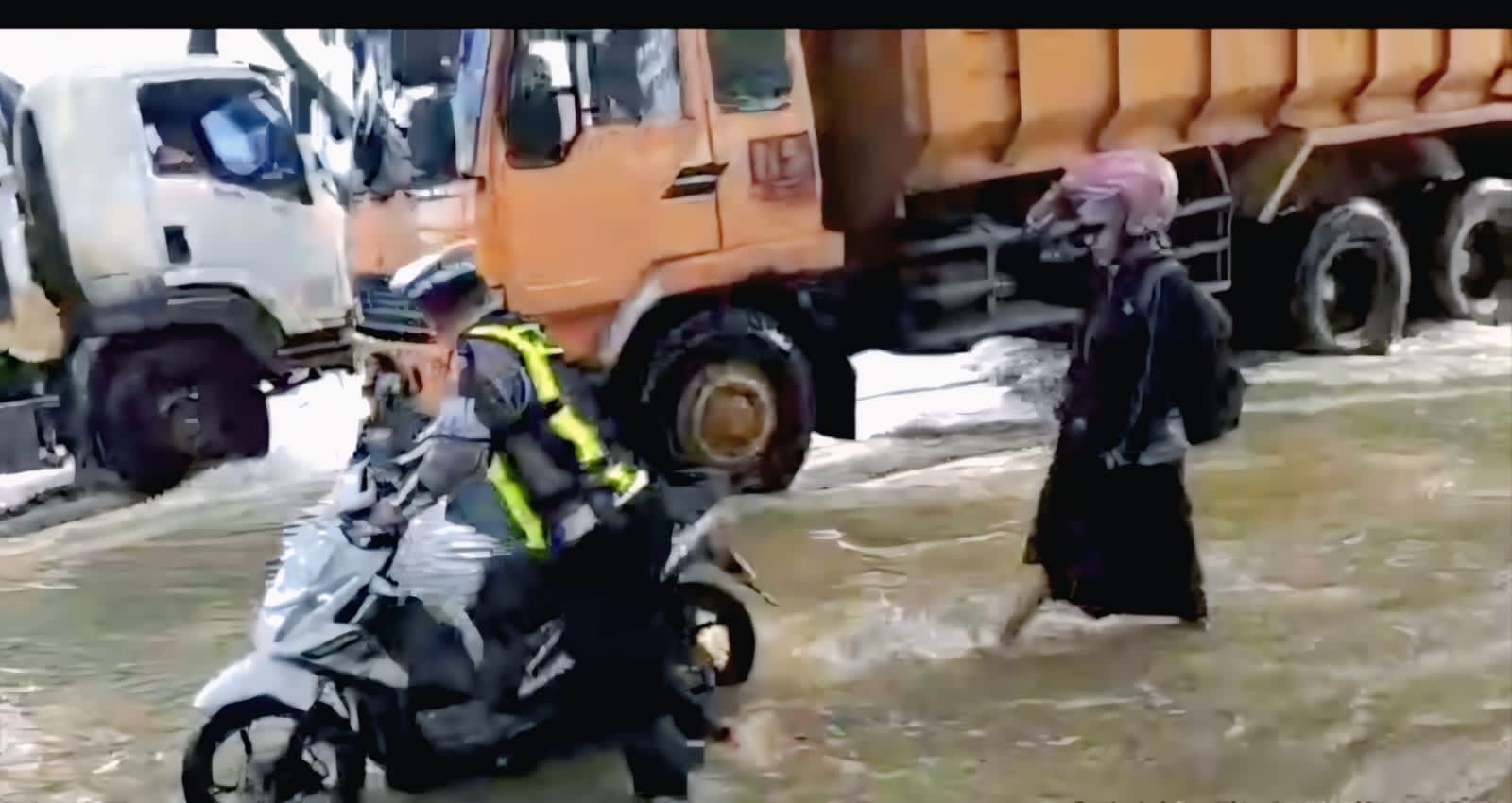 Di tengah situasi tersebut, Aiptu Hari, anggota Satlantas Polresta Pati, juga turut menunjukkan aksi simpatik dengan membantu mendorong sepeda motor warga yang mogok akibat terendam banjir.