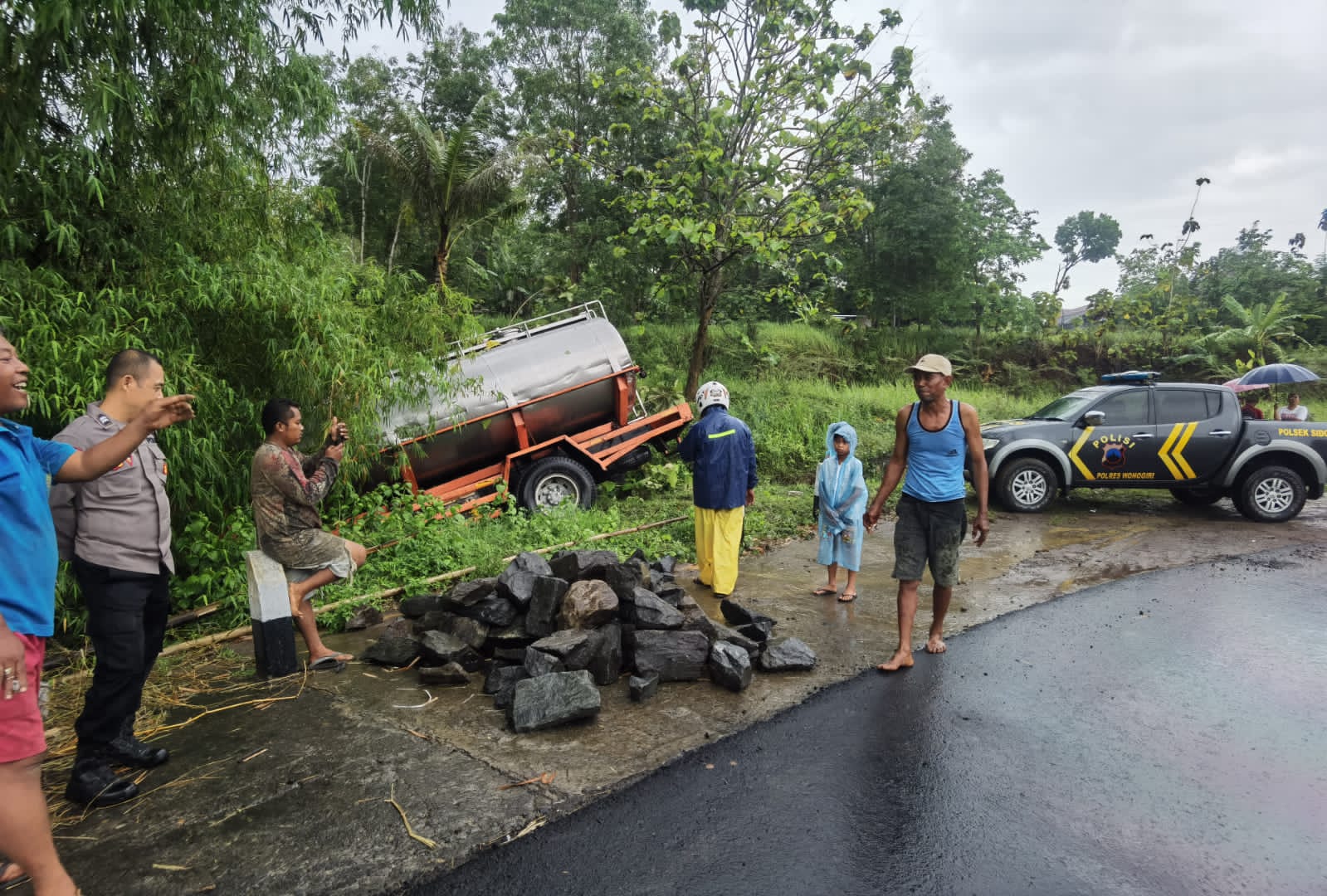 Wonogiri – Hujan deras yang mengguyur wilayah Kecamatan Sidoharjo, Kabupaten Wonogiri, Selasa (21/10/2025) siang, menyebabkan sebuah truk tangki susu warna oranye bernomor polisi AG 8773 US mengalami kecelakaan tunggal di ruas Jalan Ngadirojo–Wonogiri-Ponorogo, tepatnya di tikungan Irung Petruk.