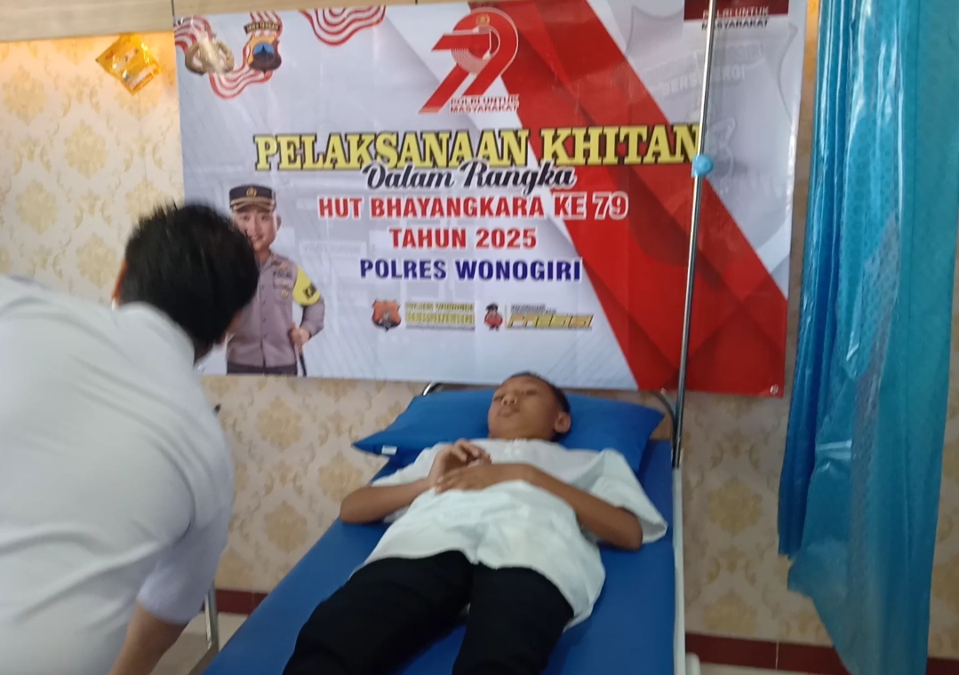 Wonogiri – Dalam rangka menyambut Hari Bhayangkara ke-79, Polsek Purwantoro Polres Wonogiri Jawa Tengah menggelar kegiatan bakti sosial berupa khitan gratis bagi anak-anak dari keluarga kurang mampu. Kegiatan dipimpin langsung oleh Kapolsek Purwantoro, Iptu Nugroho Setyo Hartono, SH., bersama jajaran anggota serta Ketua Ranting Bhayangkari Polsek Purwantoro dan para pengurusnya. (16/6/2025).