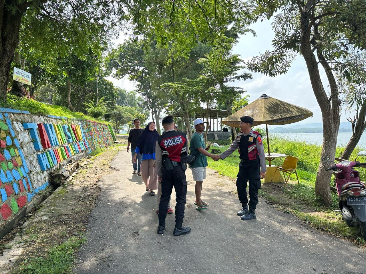 Personel Sat Samapta berkeliling kawasan wisata, memberikan imbauan kepada pengunjung dan pelaku usaha agar bersama-sama menjaga keamanan dan menolak segala bentuk praktik pungli.