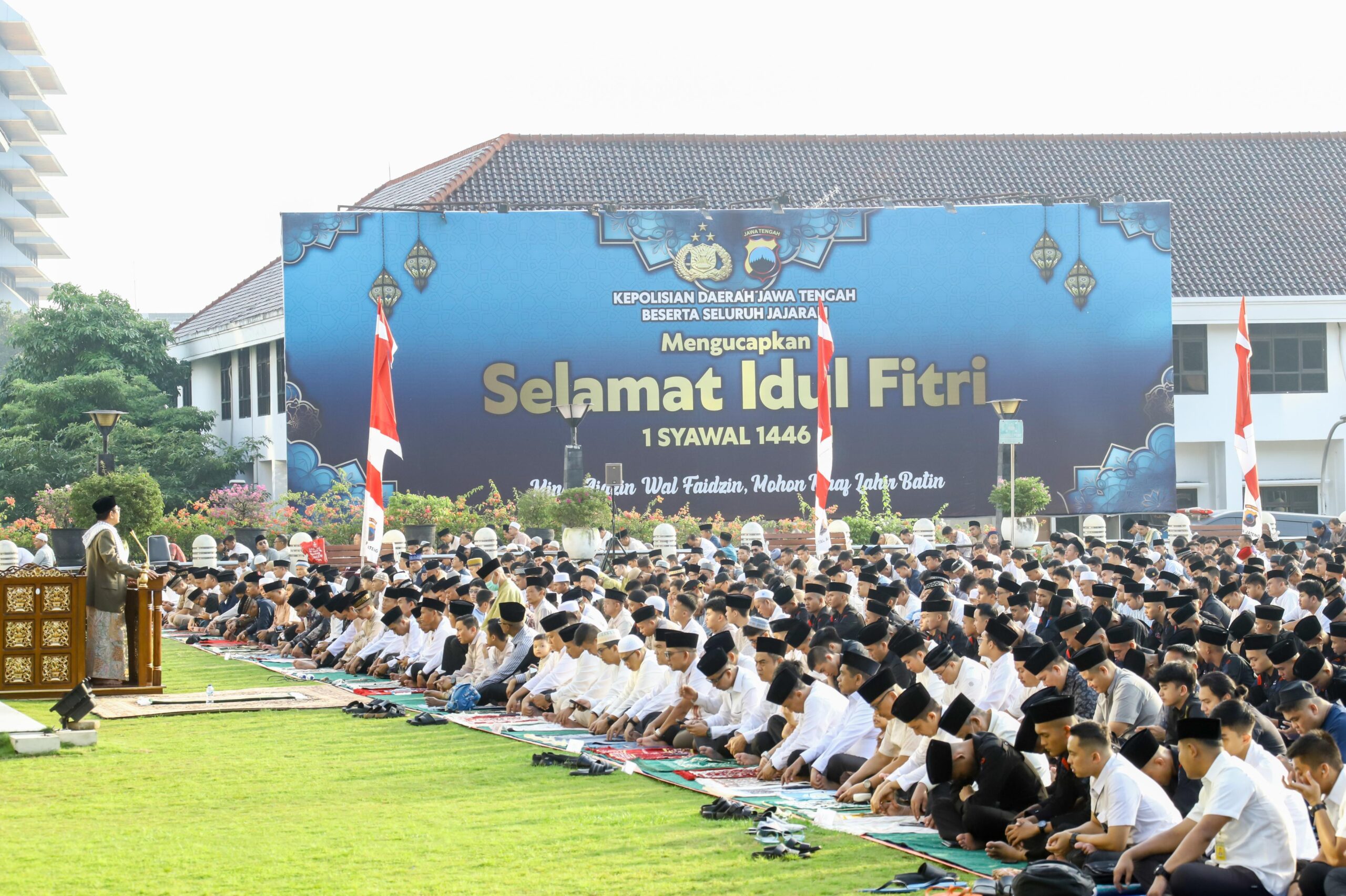 Shalat Ied dihadiri langsung oleh Kapolda Jateng Irjen Pol. Ribut Hari Wibowo, didampingi Wakapolda, Pejabat Utama (PJU) Polda Jateng, serta personel dan warga sekitar Mapolda Jateng. Bertindak sebagai imam sekaligus khatib adalah Prof. Dr. KH. Rosihan, M.Ag., dengan bilal Ustadz Sohibul Muharom.
