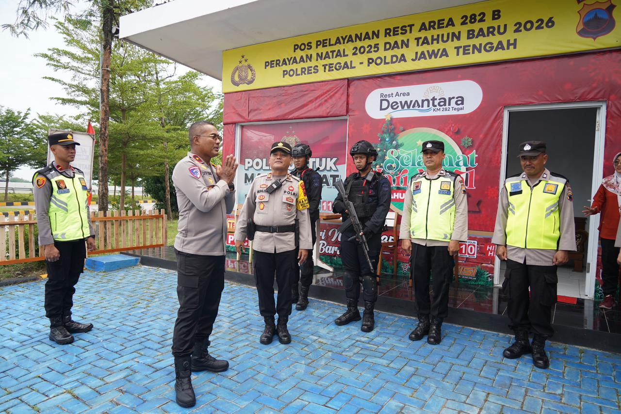 Polda Jateng, Brebes | Wakapolda Jawa Tengah Brigjen Pol. Latif Usman melaksanakan peninjauan langsung Pos Pengamanan (Pospam) dan Pos Terpadu di sejumlah rest area sepanjang jalur Pantura Jawa Tengah, Rabu (24/12/2025). Kegiatan ini dilakukan dalam rangka memastikan kesiapan personel, sarana prasarana, serta kelancaran arus lalu lintas selama Operasi Lilin Candi 2025 menjelang perayaan Natal 2025 dan Tahun Baru 2026.